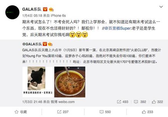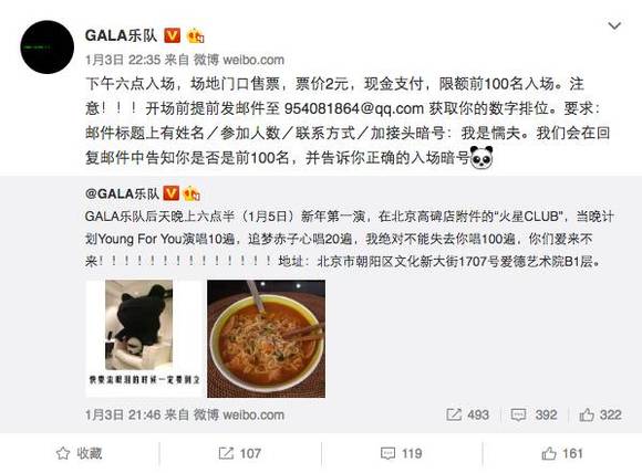 事情还要从乐队1月3日晚间发布的两条微博说起。微博中,Gala宣布将于1月5日在北京高碑店举办“新年第一演”,门票2元/张,限额100人。1月4日凌晨4:53,乐队即宣布“票已售罄,100个名额已满”。
