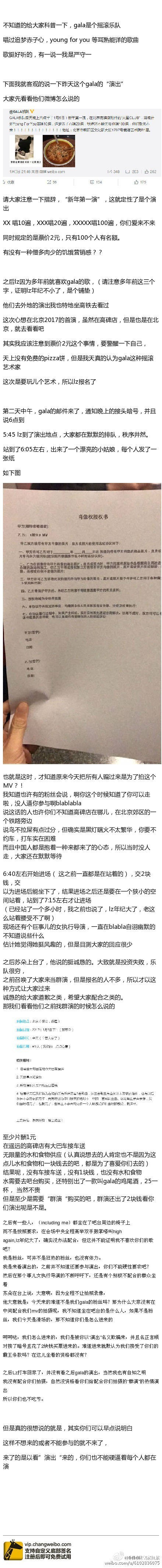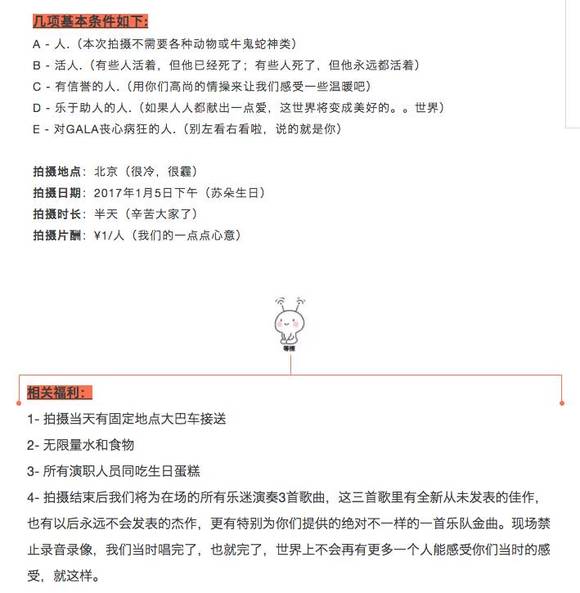 其实从@呵呵哒皇家红茶微博中我们也可以看到,Gala之前曾发布过一篇征集群演的微博文章。经查阅,这篇名为《你是猴哥派来的救兵吗?》的文章发布在不久前的12月29日(Gala官方微信也有同步推送),文章中,Gala也的确表示了1月5日的演出是为了MV的拍摄,与1月3日微博表述不同的是,乐队不仅承诺会支付每位歌迷1元的片酬,还会提供大巴车接送、水果供应等福利。