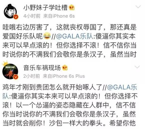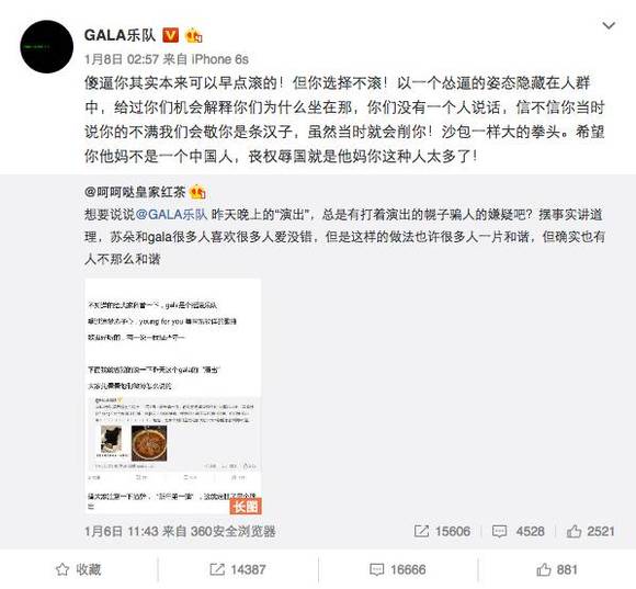 到1月8日凌晨,Gala对该歌迷做了如下回应,“滚”、“怂逼”、“丧权辱国”等字样很是扎眼: