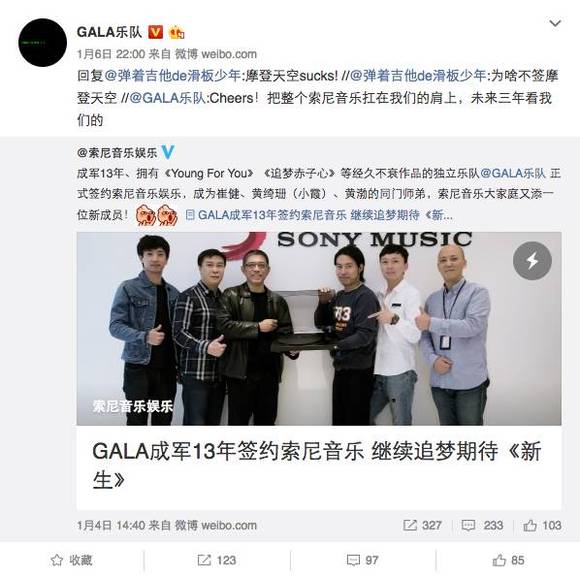 实际上,在这次事件当中,除了歌迷,利益链牵扯到的还有Gala不久前刚刚签约的索尼音乐。