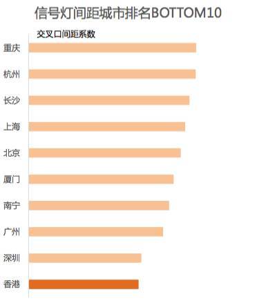 在交通信号灯间距这一指标上,厦门位居倒数第5。信号灯间距的缩短(交通信号密度的增大)将造成交通出行时间和延误的增多, 每个交通信号会使速度减少 2~3 km/h。全国百城的信号灯间距平均为638m,十大堵城为495m,低于全国平均水平。香港在该项指标上表现最糟糕。