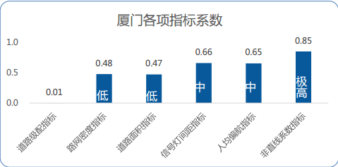 在这6项指标上,厦门的表现几乎都不好,在道路规划上存在有“先天”的不足。造成这一结果的原因既有客观的(如地形地貌、历史遗留问题),也有主观的(如规划能力)。但面对不利条件,厦门的城市管理者通过科学的交通治理,取得了不俗的成绩,排名全国第35。