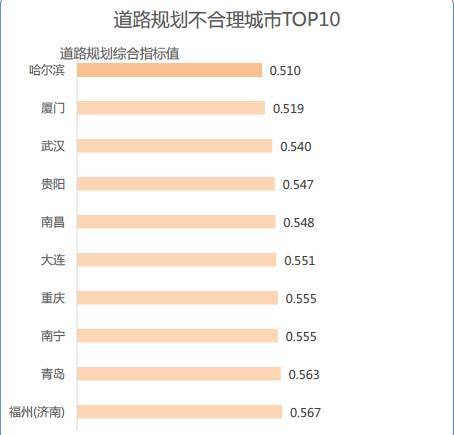 在道路面积率指标上,厦门高居不合理城市倒数第10。按照《城市道路交通规划设计规范》规定,城市道路用地面积应占城市建设用地面积的8%-15%。全国百城的道路面积率平均为5.58%,远低于规范值及主要发达国家平均水平。在这项指标上,香港再度傲视全国。