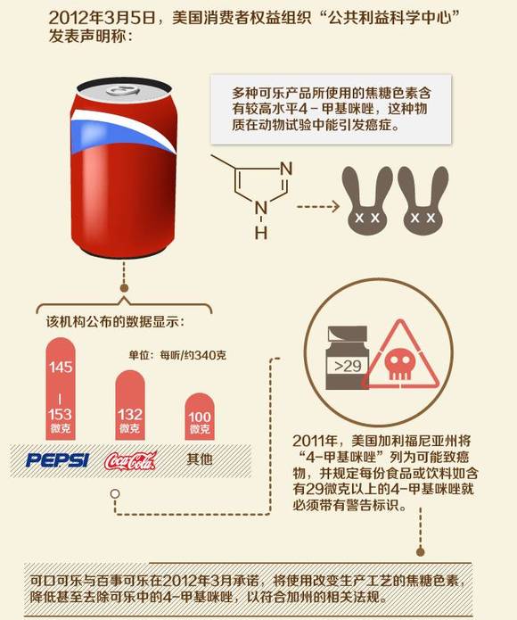 2012年,可乐中检出微量的4-甲基咪唑曾让美国消费者坐立不安,事件最终以可口可乐公司和百事可乐公司主动宣布改进可乐生产工艺而平息下来。(关于可乐中的4-甲基咪唑含量到底如何,消道长也正在准备相关的检测,大家记得持续关注“消费者报道”哦!)