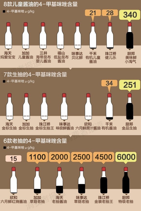 老抽中的4-甲基咪唑明显高于儿童酱油和生抽,其中厨邦特级老抽的4-甲基咪唑含量最高,达到6000μg/kg(6mg/kg),食用5毫升,已超过美国加州规定必须警告的29μg(微克)的参考值。