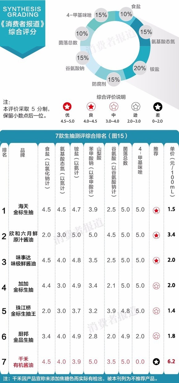 综合所有指标,海天金标生抽综合品质较优,列为本刊推荐产品。
