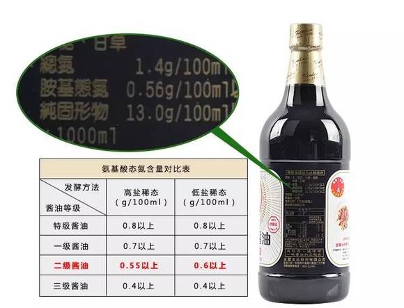如果想选购鲜味更高的酱油,留意酱油外包装标签中是否有“特级酱油”的字眼,还要留氨基酸态氮是否达到0.8g/100mL。