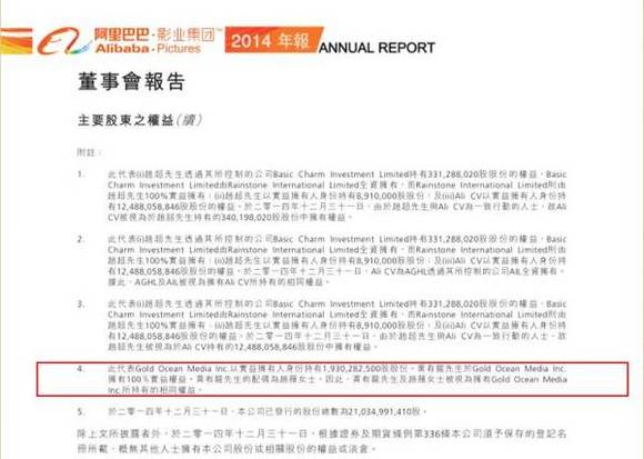 这笔投资往往被外界冠赵薇之名。但野马君(微信公众号YMCJ8686)发现,真正出手入股的人是她老公黄有龙。阿里影业2014年年报对这件事情有过较为清晰的陈述,花25亿元人民币入股的Gold Ocean Media实际上是黄有龙100%控股的投资公司。