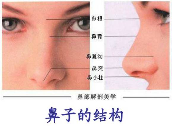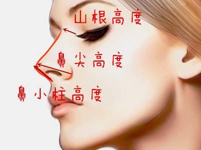 然后给大家介绍两个词:鼻尖高度、和鼻小柱高度。山根高度是大家都知道的一个高度,也是比较容易改变的地方,鼻尖和鼻小柱高度如下图。