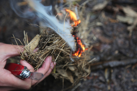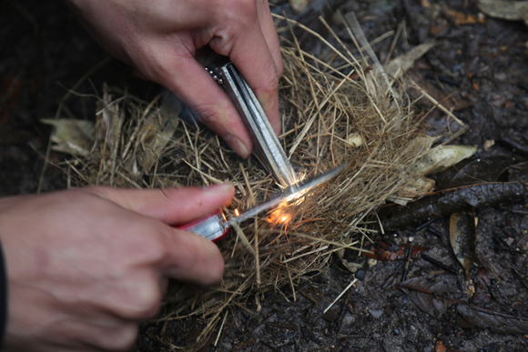 我试了一下。发现要领是离得近,用刀和火石压住火绒;其次要锲而不舍,刮出火星后还要反复刮火石,才能扩大星星之火,使之最终燃烧起来。