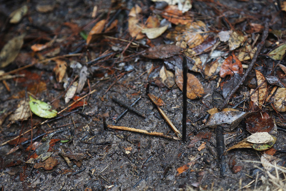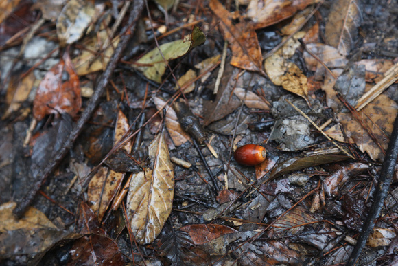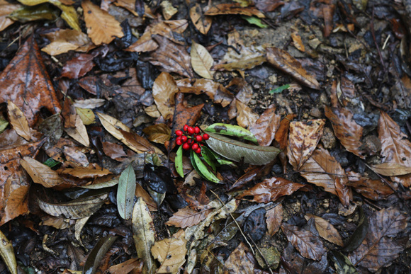如果是夏秋季节,莫干山上会有大量的野果,如桃、梨、野草莓,还有板栗。而12月份的冬雨洗刷下,山地上只剩下蕨类和榛子可以吃。我还发现地上散落着几粒鲜红的果子,一片枯黄泥泞之中,颜色欢脱得诱人采撷。这能吃吗?Allen回答说,这就刚好要讲到另一个故事了。