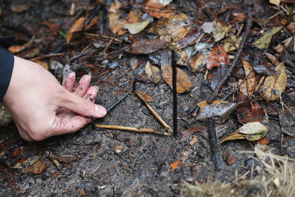 此刻我们在莫干山上的一片山林里,江浙12月的雨后,空气里一股甜湿。跟着两位教练在陡峭泥泞的山路(此前由教练们开辟出来的一条山间小径,无石板铺路)上徒步了一段后,我们来到了第一处庇护所,一处用树干和枝叶搭建的简易棚。在高阶挑战体验里,队员们会被要求自己搭建这样一个处所。在那里,Allen停下来开始做讲解,揭晓刚才究竟捡了些什么宝。