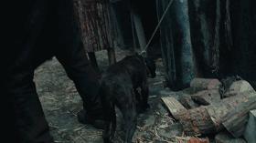 一条黑狗到处觅食,一口大锅里煮着满是血水不知是什么的肉块: