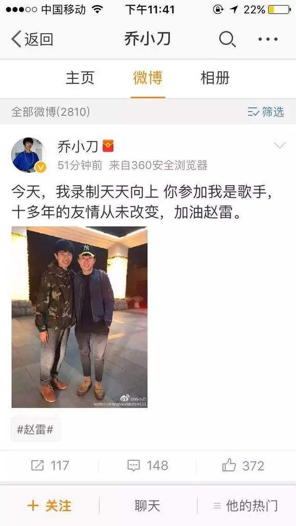 与此同时,乔小刀的微博也证实了,此前爆出的赵雷将参加湖南卫视《歌手》的传言。