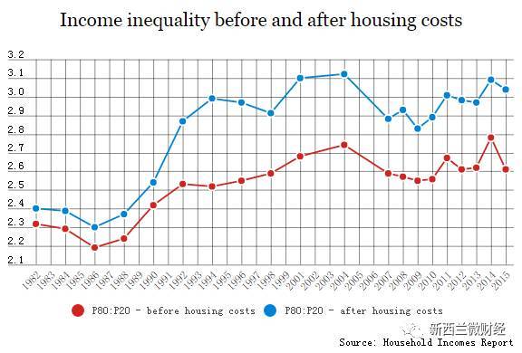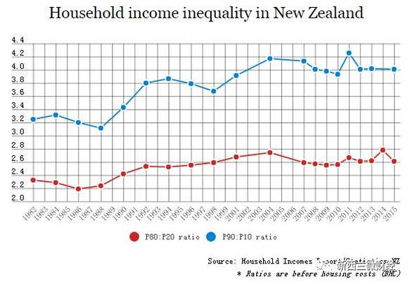下表展示的是新西兰历年不平等指数趋势表。不平等指数衡量标准之一的P90/P10值是指顶层10%与底层10%的财富比值(蓝色)。打个比方,假如指数4.0,就意味着,要成为收入最高的那10%的家庭是最低的那10%的家庭收入的4倍。P80/P20值则指20%收入最高家庭的财富总量与20%收入最低的家庭收入的比值(红色)。
