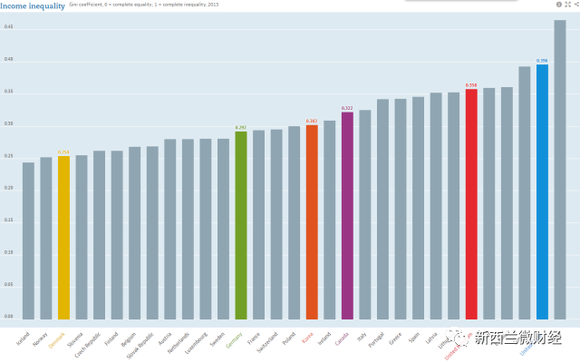 从上表中新西兰的情况来看,自上世纪80年代来,其基尼系数整体呈上升趋势,2013年到2015年,从0.33一路上涨追平了历史最高值0.35。