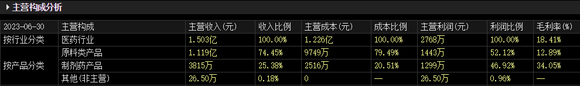 分产品来看,向日葵的营收主要来自于原料药产品和制剂类产品,根据公司2023年中报的数据,这两类产品占营业收入的比例分别为74.45%和25.38%。其中,毛利率较高的是制剂类产品,毛利率达到34.05%。