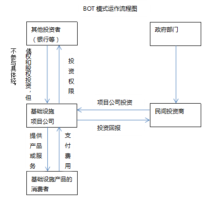 BOT(Build-Operate-Transfer)即建造—运营—移交方式。该方式最大的特点就是用基础设施有期限的经营权抵押以获取项目融资。在BOT模式下,首先由项目发起人通过投标从委托人手中获取对某个项目的特许权,随后组建项目公司并负责进行项目的融资、建设以及运营管理,在特许期内通过对项目的开发运营以及当地政府给予的其他优惠来回收资金以还贷,并取得合理的利润。特许期结束后将项目无偿地移交给政府。在该模式下,投资者一般要求政府保证其最低收益率,一旦在特许期内无法达到该标准,政府应给予特别补偿。