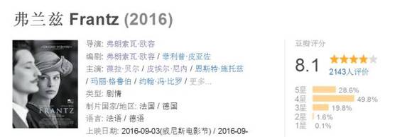 作为一部非典型的欧容电影,纵观欧容的电影取向,[弗兰兹]简直可以说是小清新了,每个看片的人似乎都在等一个扣人心弦的欧容式大反转,但是却迟迟没有等到。