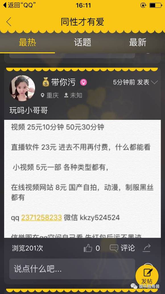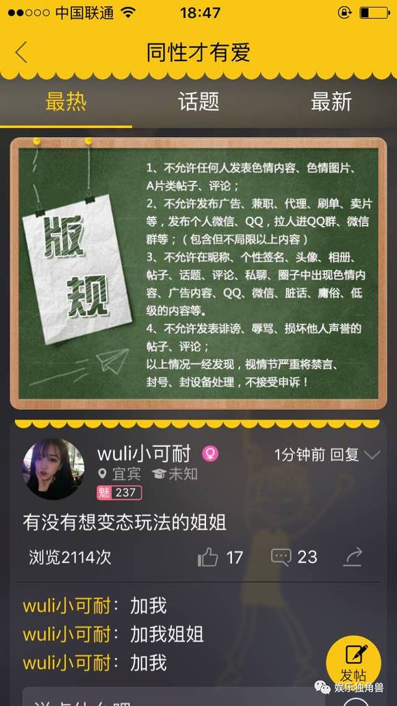 但翻看APP上的内容,色情内容依然大量存在,眼前是各种“污”……而且从一些用户发布的文字和图片来看,有的直接表明自己是中学生,有的自拍照片上一身校服配着一张稚嫩的脸,说明用户中确实有未成年人。