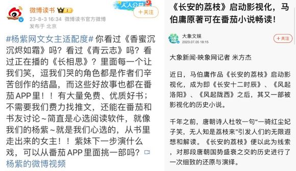 例如,引入大量传统出版内容,合作马伯庸、骁骑校等已成名作家。2023年6月推出影视向内容征稿活动,8月官宣手握多部IP热剧的杨紫为品牌代言人,趁势对番茄的影视原著储备进行宣传。总而言之,在大众印象中全面增强番茄小说与热播长剧的关联度。