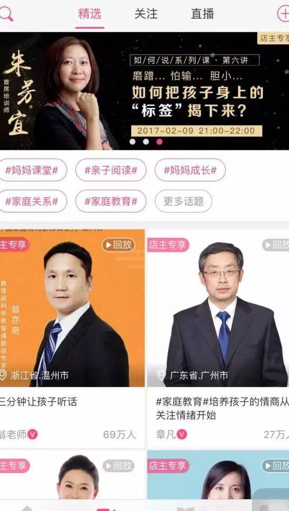 吴方华进一步说道,现在很多作者都愿意把书放到大V店的平台上卖,因为相比于其他电商,大V店不只是一个平台,同时还会帮助作者进行运营、宣传推广。尹建莉、杨红樱、杨澜、以及去年获得安徒生大奖的曹文轩等教育领域的专家,基本上都在大V店平台上或直播、或讲过课。目前,大V店亲子教育领域专家的数量、听课人数都是行业第一。