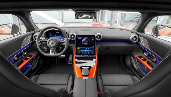 内饰设计与新AMG SL相似,采用了一体化全液晶仪表和立体遮阳板。中控屏为竖向悬浮式,尺寸为11.9英寸,搭载奔驰最新的MBUX人机交互系统。方向盘覆盖Nappa真皮,集成了多种驾驶控制功能。