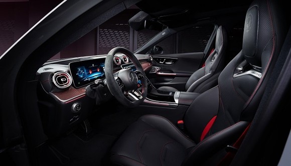 内饰保持了与全新C级相似的设计风格,大量使用了碳纤维材料来提升性能感,同时方向盘配备了翻毛皮材质以增强握感。中控屏幕支持智能互动功能,专为AMG和混合动力车型定制。座椅采用具有侧向支撑的高性能设计,提供额外的舒适和支撑。
