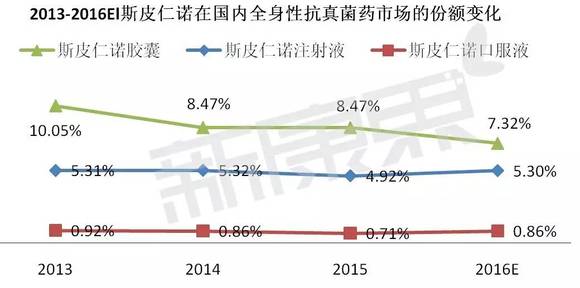 伊曲康唑本品为合成的三氮唑衍生物,具有广谱抗真菌作用,可抑制真菌细胞膜麦角甾醇的合成。强生2016年第四季度财报显示感染疾病用药的销售额为32.08亿美元,同比下降了12.3%。在国内全身性抗真菌药市场中,2015年斯皮仁诺胶囊的市场份额为8.47%,位列第4,斯皮仁诺注射液和口服液分别以4.91%和0.71%的份额位列第6和23。斯皮仁诺胶囊近几年的份额呈现下降的趋势。预计2016年除了胶囊外,注射液和口服液的份额将有所回升。