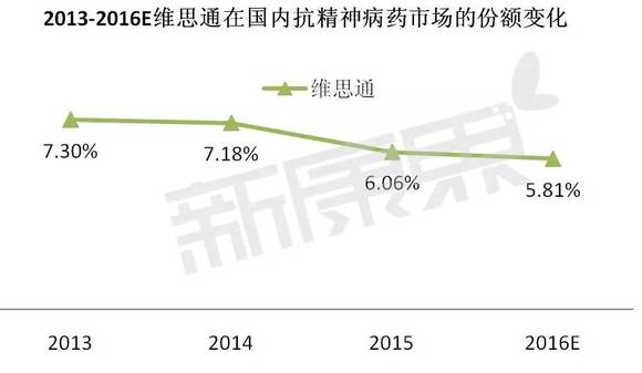 利培酮是一种选择性单胺能拮抗剂,可以改善精神分裂症的阳性症状,而它引起的运动功能抑制,以及强直性昏厥都要比经典的抗精神病药少。2015年维思通在抗精神病用药的市场份额约为6.0%,在Top10品牌中位列第6。但该品种的仿制药生产企业众多,预计在2016年维思通的市场份额将进一步下降。