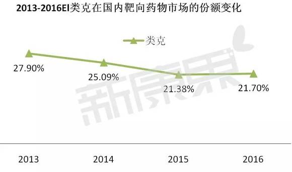 英夫利西单抗是肿瘤坏死因子的抑制剂,主要适应症为类风湿关节炎、克罗恩病、瘘管性克罗恩病和强直性脊柱炎。根据强生2016年第四季财报显示,类克2016年全球销售额为69.66亿美元,同比增长了6.2%,创下历史新高。而在国内的抗炎抗风湿靶向治疗药物市场中,2015年类克以21.38%的市场份额位列第二,但受修美乐以及国产重组人Ⅱ型肿瘤坏死因子受体-抗体融合蛋白快速增长的影响,份额较2014年有所下降。随着类克在更多的城市被纳入医保,预计在2016年份额将有所回升。