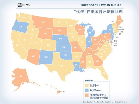 ▲ “代孕”在美国各州的法律状态(2014)。 abcNEWS