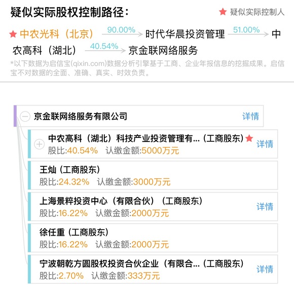 京金联的工商资料显示,在京金联的股权构成中,中农高科持股比例达到了40.54%,而其创始人王灿的持股比例仅为24.32%。京金联注册成立于2014年6月5日,总部位于湖北武汉,注册资金为1.2333亿元。京金联平台一向对外宣称,“公司由中农基金控股单位——中农高科(湖北)科技产业投资管理有限公司发起,并持有京金联60%的股份,总部位于中国武汉,属于国资背景”。