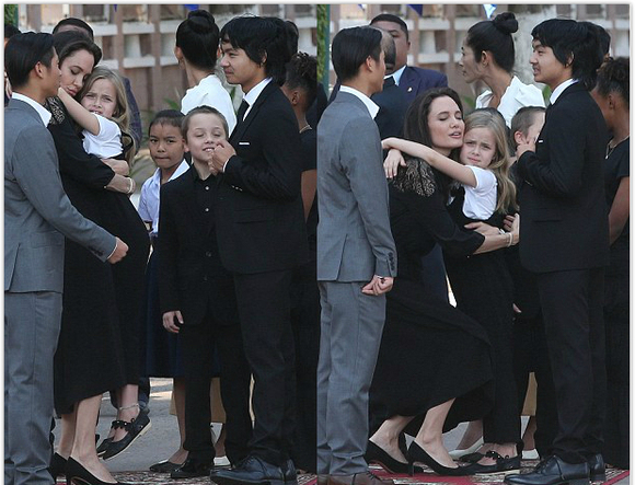 她在15岁的Maddox,13岁的Pax,12岁的Zahara和10岁的Shiloh的陪同下出席,还有8岁的双胞胎Vivienne和Knox。