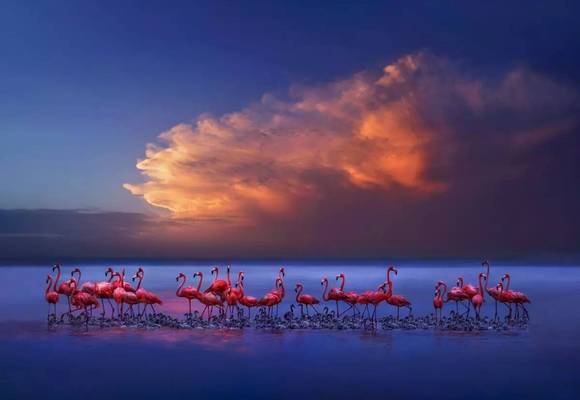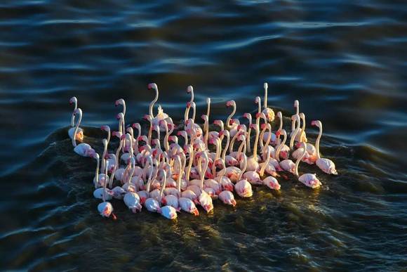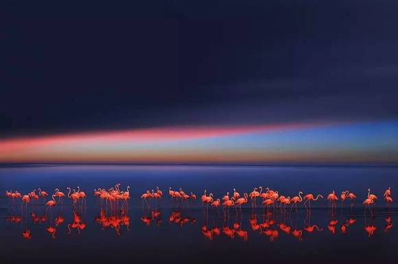 优雅的火烈鸟聚集在一起,湖光鸟影,交相呼应,远远望去,仿佛一片奇妙的微光世界。