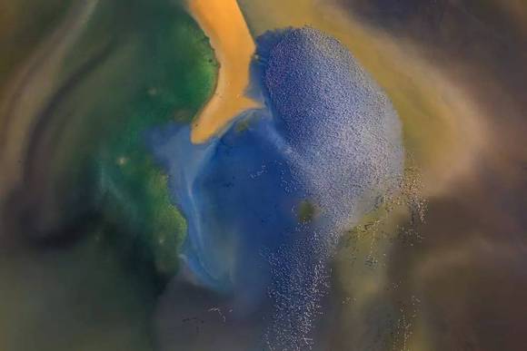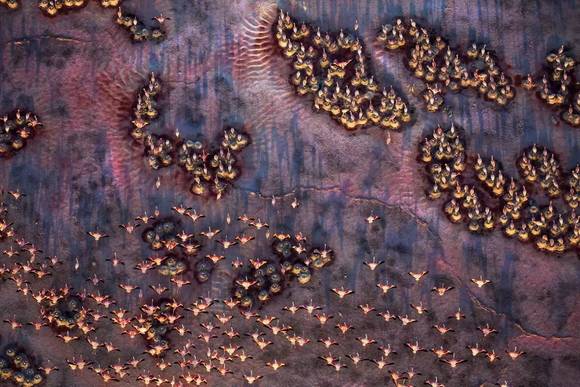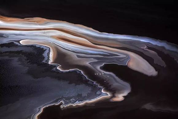 富含矿物质的土壤与高盐碱度的湖水在光线的反射与折射下,会呈现出扑朔迷离的色彩组合,与云彩的倒影、细腻的波纹、浮游的鸟儿一起,构成错综复杂的视觉关系,就好像上帝在这里用大自然的颜料创作的画作。