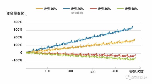按照相同的仓位比例进行下注模拟交易,在大量交易次数后的结果就如上图所示。仓位比例孰优孰劣一看便知。