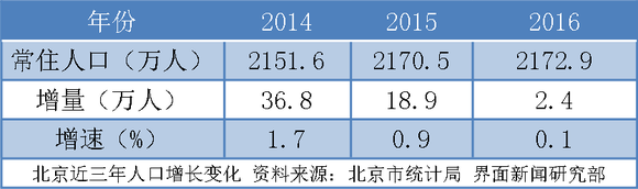 功能疏解的成效主要体现在人口上,截至2016年末,北京市常住人口为2172.9万人,同比增加2.4万人,增量同比减少16.5万人,增速同比下降0.8个百分点,其中城六区常住人口实现由升到降的拐点,比2015年下降3%。