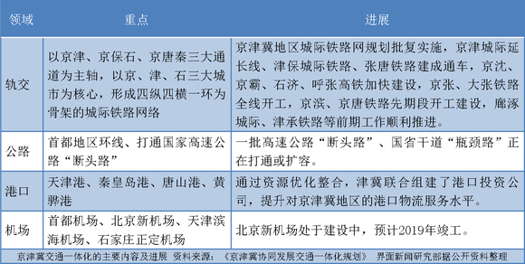 基础设施互联互通,交通一体化先行。2015年12月,发改委和交通部发布《京津冀协同发展交通一体化规划》。根据规划,京津冀交通一体化的主要内容包括轨交、公路、港口和机场四个方面。三年里,一系列交通基础设施项目有序推进,一个互联互通、更加紧密的交通圈初现雏形,为推动京津冀协同发展、有序疏解北京非首都功能、承接产业转移项目开辟了通道。