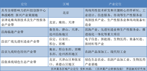 作为协同发展的关键支撑,京津冀产业协同是“最大的协同”。2016年6月,工信部和京津冀三地政府联合印发了《京津冀产业转移指南》,将京津冀划分为了五条产业带。各产业带承接产业转移的主要载体是各类园区,各园区中优先承接发展的产业方向也有明确的划分。