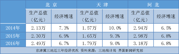 在实际发展中,三省市经济合作也日益密切。2014年-2016年,河北省引进京津资金1.1万亿元,占全省同期引进省外资金的一半以上;天津市引进京冀项目4856个,引进资金5227亿元,分别占全市的35.6%和44.0%。在全国经济下行压力较大的情况下,保持了稳中向好的发展势头。
