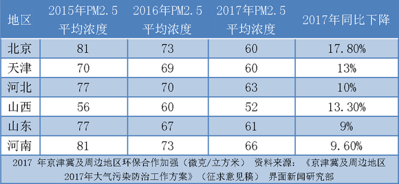 在生态环境协同方面,行政区域限制正在打破,生态环境保护和治理不断加强。2015年12月《京津冀协同发展生态环境保护规划》出台,对大气、水、土壤防治,主要污染物排放总量提出具体目标;2016年6月,环境保护部联合三地政府印发《京津冀大气污染防治强化措施(2016-2017年)》。治理效果有所显现,空气污染得到缓解,京津冀区域2016年PM2.5平均浓度比2013年下降约33%;京津风沙源治理和太行山绿化、三北防护林、沿海防护林等生态建设工程持续推进,三年内京津冀完成造林1754亩;协同力度加大,京津冀及其周边地区的环保合作不断升级。