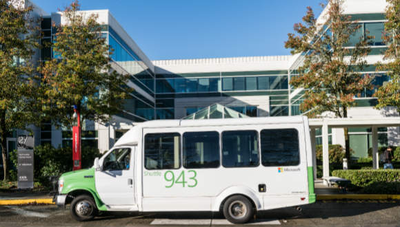 如此大的园区,当然少不了便利的通行工具。走在园区内,经常可以看到绿白色相间的穿梭巴士,员工和来访者在园区内需要车辆时,可以在任一办公楼的前台通过人工或自助预订车辆。