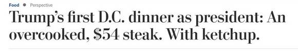 美国最有影响力的大报之一《华盛顿邮报》,专门邀请了一位美食评论家来嘲笑特朗普的晚餐,告诉读者他的牛排品味是多么缺乏教养,多么不入流,多么不开化,多么山顶洞人,多么石器时代。