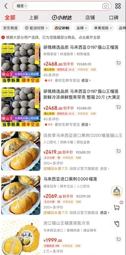 稀有的马来西亚黑刺榴莲、猫山王榴莲同样十分昂贵。电商平台上,这两种榴莲价格也最高,一斤价格在100-200元左右。