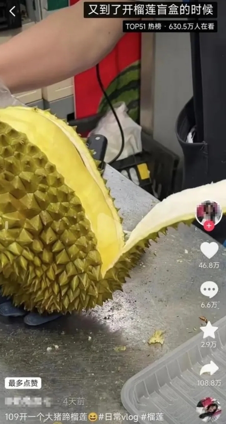 榴莲还自带“开盲盒”属性,由于外形、体格、重量相似的榴莲,其果肉数量的多寡、口感却差别极大。开榴莲的过程充满了未知感和神秘感,甚至引发了网友的跟风效仿。