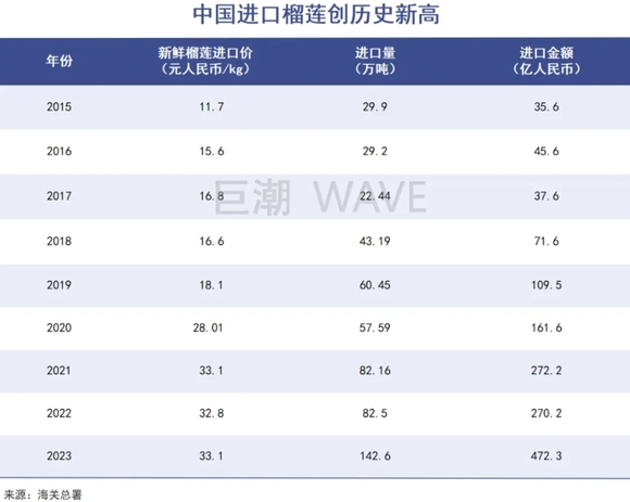 也就是说,中国几乎是榴莲的唯一市场。2023年我国进口新鲜榴莲超过142万吨,同比大增72.85%,进口额472亿元,同比增长74.8%,均创历史新高。