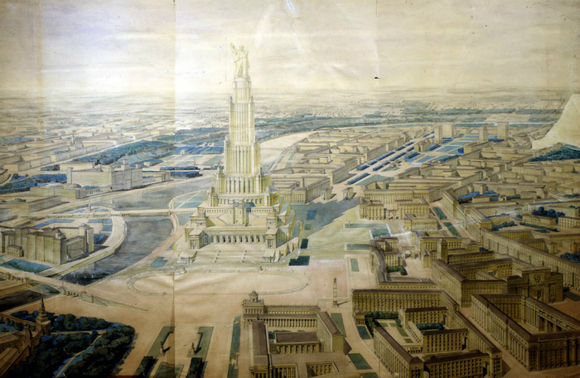 这次展览最有名的设计就是来自建筑师Boris Iofan的苏维埃宫殿。这位经验丰富的老建筑师的作品是对苏维埃统治的终极表达。宫殿的最高处是100米高的列宁雕像,最初打算的是在高度上超越美国纽约的帝国大厦。这座宫殿始建于1937年,但1941年由于德国的入侵而终止建造。