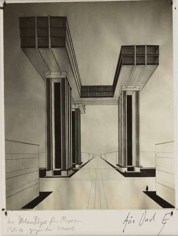 El Lissitzky设计了一系列(共8栋)轻量级横向摩天大楼,希望以此来缓解莫斯科的过度拥挤和公共交通问题。