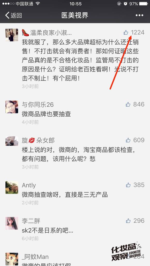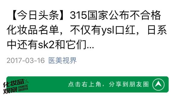 今天早上起床,在品观君刷朋友圈的时候,一眼看到一个“【今日头条】315公布不合格化妆品名单,不仅有YSL口红,日系中还有SK2和它们...”的微信文章,拉到最后,短短数小时阅读量突破了10万+,第一个评论点赞破了1000……